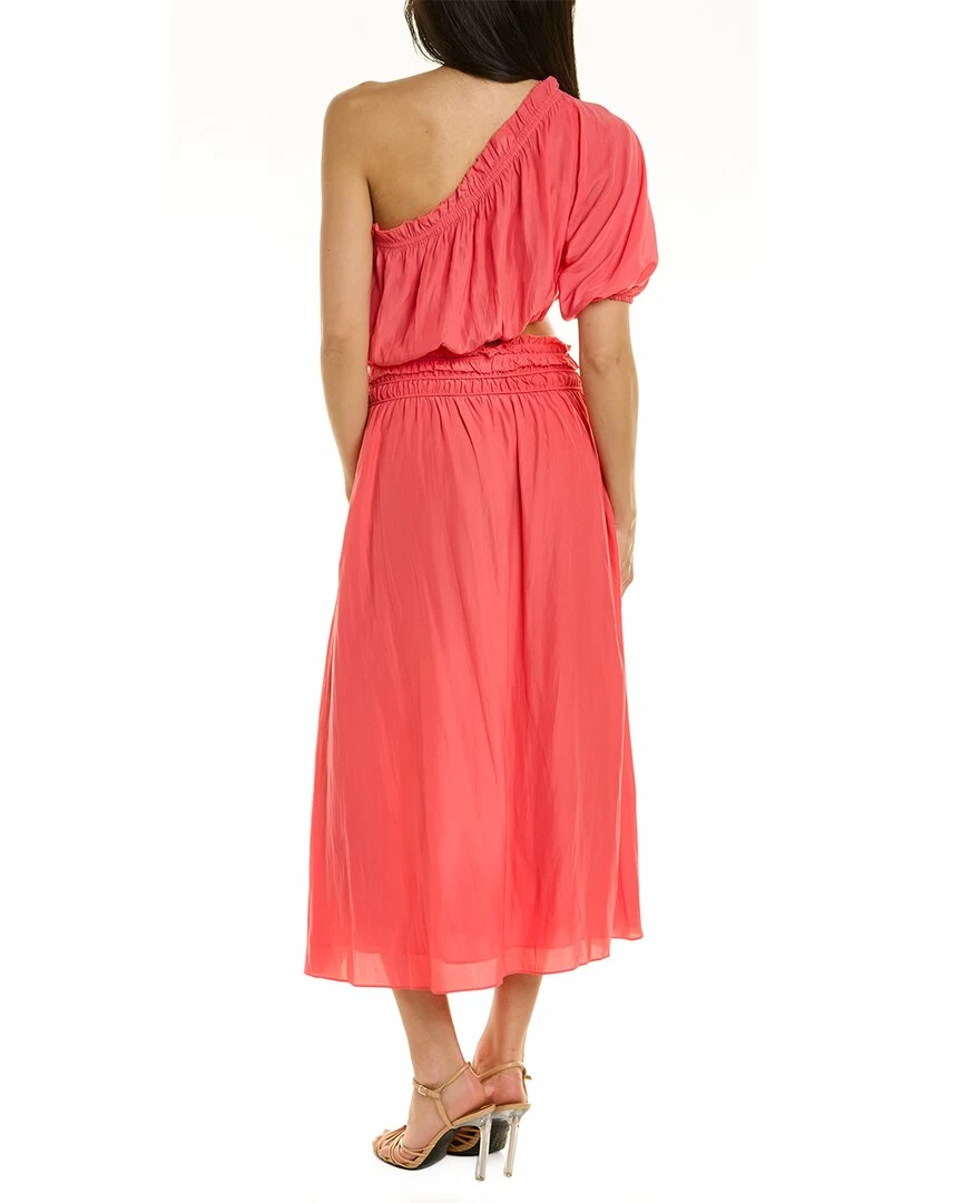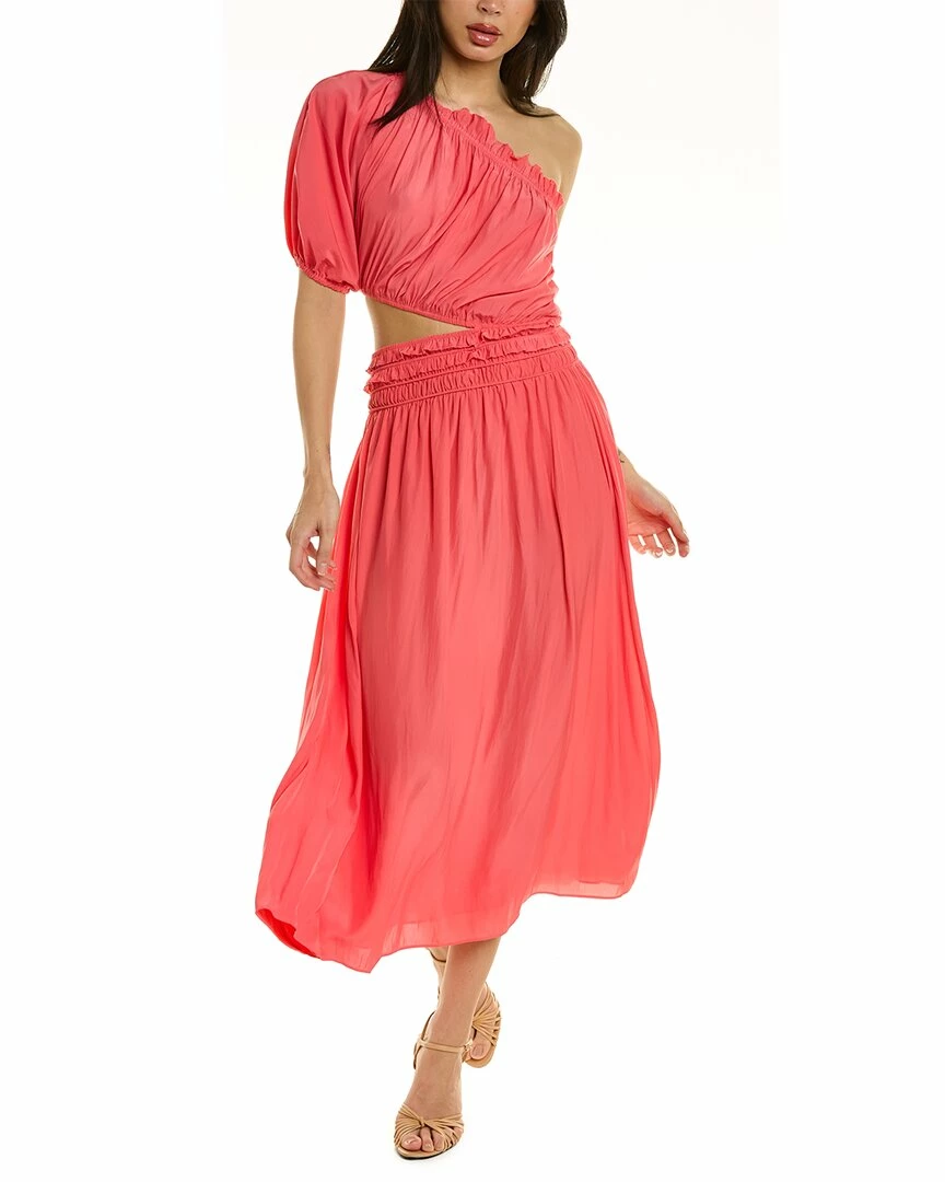 - Dina Midi Dress In Punch With One-Shoulder Design, Elbow-Length Sleeve, Cutout Waist At Right Side, And Smocked Waist