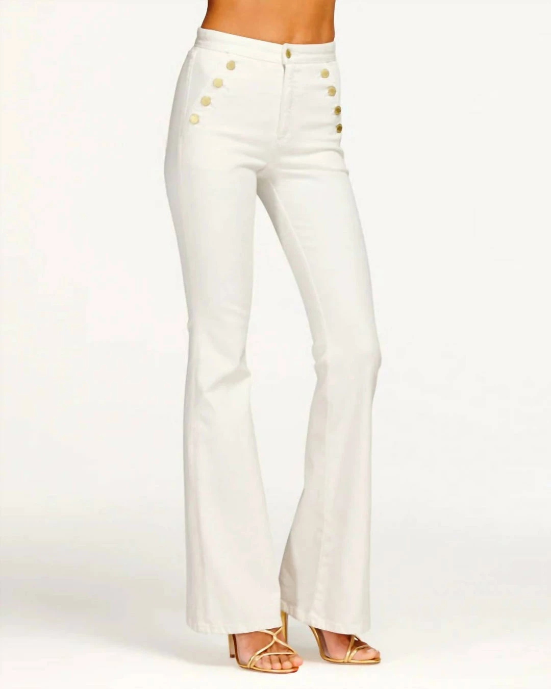 flared leg and goldtone buttons.Button closureZip flySide slash button pocketsBack patch pockets98% cotton/2% polyurethaneMachine washMade in USASIZE & FITRise, about 10″Inseam, about 35″