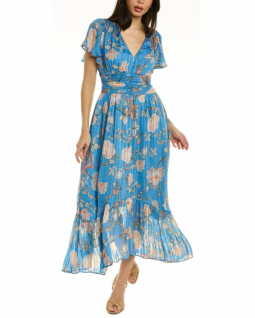 - Joan Midi Dress In Ocean Combo With Plunging Neckline, Flutter Sleeves, Ruched Waist