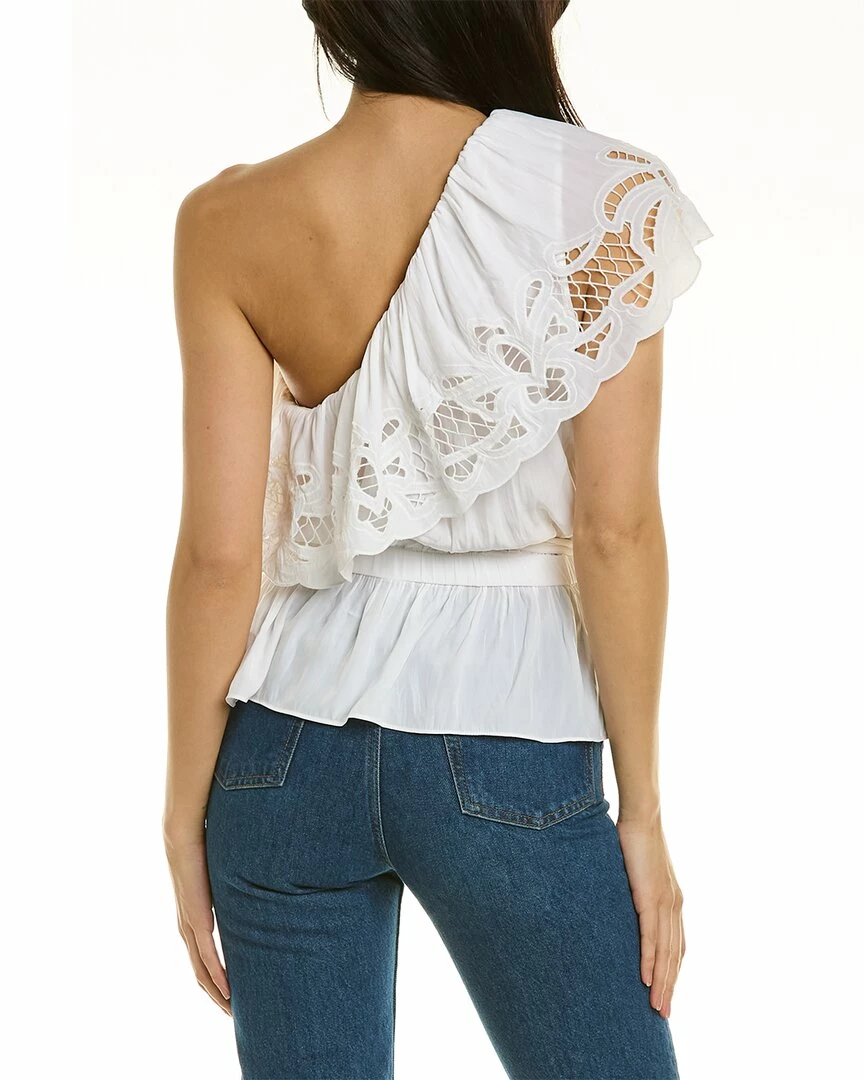 - Levon Top In Ivory With One-Shoulder Design, Lace Work Ruffle Trim, Tie Sash At Waist, And Peplum Hem