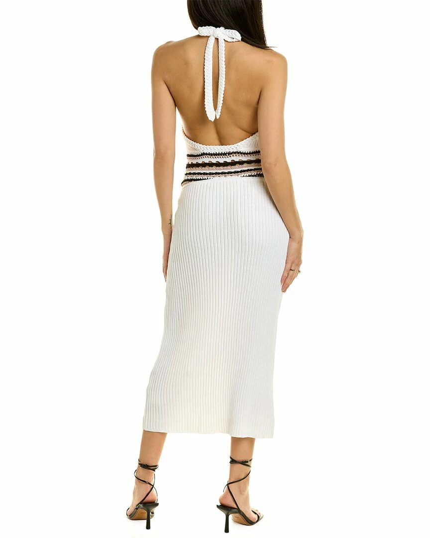 - Theo Midi Dress In Ivory Combo With Rib Knit Design, Halter Neck, Open Back, And Crocheted Waist